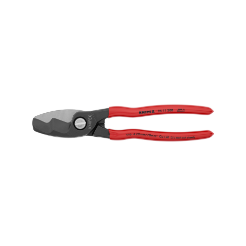 Knipex 95 11 200 cable shears cut with the twin cutting edge using a scissors action, and therefore cut very smoothly and cleanly. Diagonal cutters, with blades that meet at an obtuse angle, and which crush cable insulation and deform cable ends are not really suitable for cutting cable. The Knipex 95 11 200 cable shears demonstrate their qualities when shortening stranded and finely stranded Cu and Al cables, also with large cross-sections. For reasons of design, the cable shears must not be used to cut steel wire or hard drawn copper conductors.