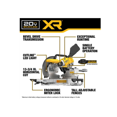 With the DEWALT DCS785B you can precisely execute miter and bevel cuts with the 20V MAX* XR 12 in. Double Bevel Sliding Miter Saw, our first 12 in. 20V MAX* Miter Saw compatible with our entire range of 20V MAX* and DEWALT FLEXVOLT batteries‡ (sold separately). Featuring regenerative braking technology, this miter saw offers exceptional runtime and efficiency. The bevel gear transmission helps maximize runtime by minimizing the power lost in the system. As our largest cut capacity 20V MAX* miter saw, this saw delivers up to 371 cuts in 3 1/4 in. MDF Base Molding** and up to 153 cuts in pressure treated 4 in. X 4 in. timber**. With the DEWALT DCS785B integrated WIRELESS TOOL CONTROL designed to maximize productivity, this product captures up to 97% of dust†† to help maintain a clean work environment (battery and charger sold separately).