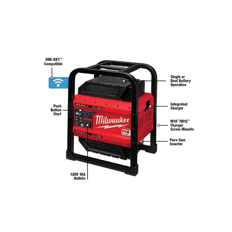 The Milwaukee MXF002-2XC MX FUEL CARRY-ON 3600W/1800W Power Supply provides the best temporary power for the job. Power more on-demand with efficient, quiet, and portable power anywhere. The portable power supply provides 3600 peak watts, 1800 continuous watts of pure sine inverter energy, powering everything from high demand 15A tools to sensitive electronics. The compact size, no emissions, and quiet operation of the power supply unit allow it to be used safely in confined spaces indoors. The metal roll cage delivers durability for outdoor jobsite use. The battery-powered generator eliminates the cost of gasoline and doesn’t require engine repair or maintenance, reducing downtime to get jobs done faster.