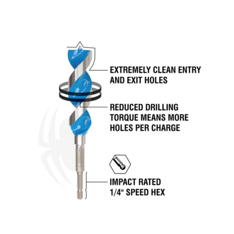 The Spyder Assorted Woodboring Power Bit Set bores up to 40x faster and with 50% less torque than conventional woodboring bits, making it ideal for fast, clean, precise applications using both low- and high-torque cordless drills. Featuring Stinger’s patent pending non-clogging, auto-feed tip technology, the Power Bit™ won’t wander, allowing for no-thrust drilling.