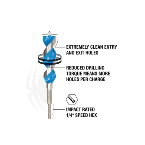 The SPYDER Woodboring Power Bit™ holes are extremely clean and burr-free, making them excellent for precise applications in hardwood, drilling through holes in laminated wood materials, and for stud drilling applications where wire will be pulled. The Spyder Power Bit™ makes clean holes like a Forstner bit while its auger-like flutes allow deep hole drilling. Not for use in wood with nails, screws, staples or other foreign objects.