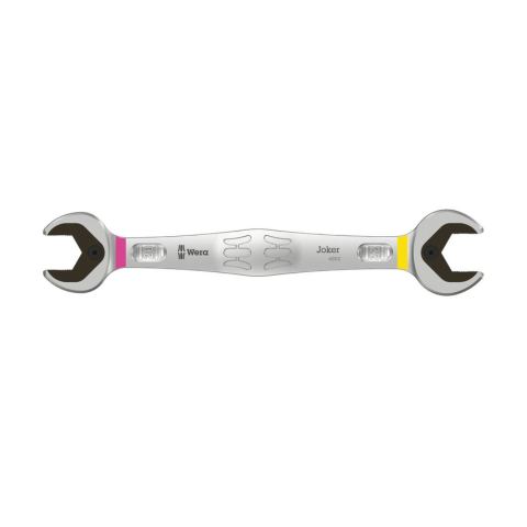 The WERA Joker 6002 Double Open-Ended Wrench is a versatile tool that features a metal plate in the jaw that provides a secure grip, ensuring a practical holding function during use. With a limit stop that prevents slipping and a double-hex geometry that reduces the risk of slippage, this wrench offers precision and control with every turn.