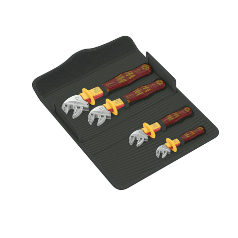 The WERA Joker 6004 4PC VDE Set Self-Setting Spanner anti-slip protection and sliding function of these spanners ensure contactless and secure opening of the non-insulated jaws. The automatic and continuous gripping of hexagon screws or bolts, coupled with the lever mechanism to prevent slipping and damage, make these spanners a reliable choice for various applications.