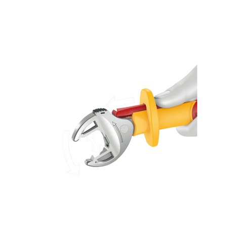 Equipped with insulated handles and anti-slip protection, the WERA Joker 6004 VDE Self-Setting Spanner Wrench provides a secure grip while working. The sliding function allows for contactless and safe opening of the non-insulated jaws. The wrench features an automatic and continuous grip of hexagon screws and bolts, with a lever mechanism that prevents slipping and damage.
