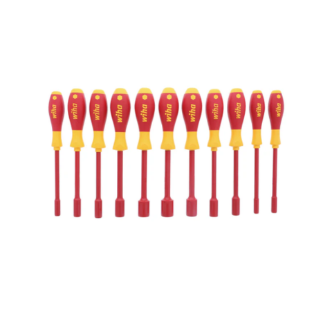 The WIHA 11PC Nut Drivers 1000V Insulated SoftFinish cushion grip handle provides ergonomic comfort and superior control, while the handle’s direct molding to the blade guarantees a permanent bond. Featuring parallel flats to prevent rolling off work surfaces and proportionate handle sizes for consistent mechanical advantage, these nut drivers are designed for efficiency and ease of use.