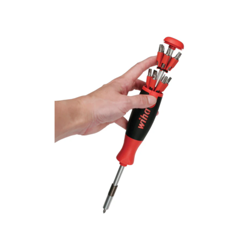 The WIHA 14PC Ultra Driver 26-in-1 Bit Holder Set is only one tool but is equipped with 13 different drives at hand anytime, anywhere. The Ultra Driver replaces an entire screwdriver set. At the press of a button, the bit magazine at the handle end comes out, delivering the 25 mm bits with a 1/4″ drive ready for removal.